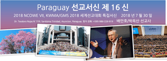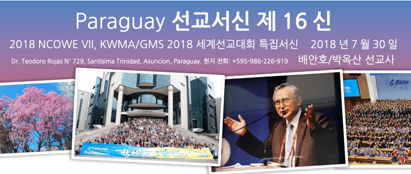 연일 무더위로 시달리고 있는 조국의 여름더위 소식과 정반대로 이곳, 파라과이는 지금 매서운(?) 겨울 추위로 사람들이 힘든 시간을 보내고 있습니다. 지난 6월은 한국교회의 하계 올림픽이라고 할 수 있는 KWMA 세계선교대회(6/18-21@부산수영로교회)와 GMS세계선교대회(6/25-28@대전새로남교회)의 강사로 초청받아서 모국을 약 1달간 방문(5/31-7/4)하였습니다. 따라서 한국교회를 대표하는 2개의 굵직한 선교대회를 강사로 참석하며 경험한 감동과 느낌 등을 이번 선교서신 광주리에 담았습니다.