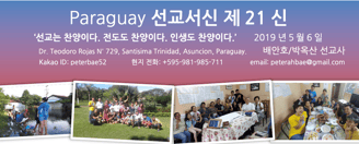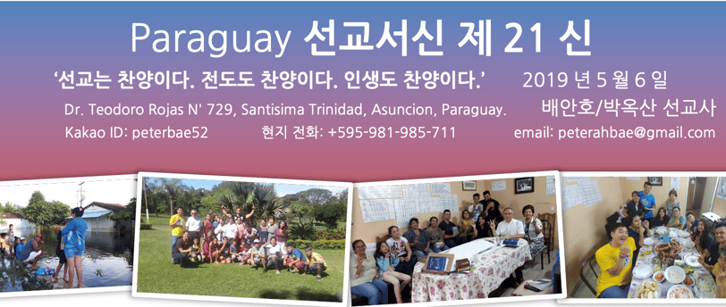 2019년 갈보리교회의 부활절예배는 초대교회의 전형적인 가정예배 모습이었습니다. 3주 전부터 파라과이 강물이 범람으로 갈보리교회당은 허리까지 물속에 잠겼습니다. 볼리비아와 브라질 상류지방에서 엄청 많은 비가 내린 덕분에 파라과이 강의 수위가 갑자기 높아진 것입니다. 갈보리교회가 위치한 곳은 수도, 아순시온시에서 가장 가난한 자들이 모여 사는 지역입니다. 지난 4월 14일 (종려) 주일에는 가까운 Botanico 국립공원에서 예배를 드렸습니다. 부활절에도 공원에서 예배를 준비하고 있는데, 새벽부터 많은 비가 내렸습니다. 파라과이는 주일에 비가 오면 주일예배 참석수가 뚝 떨어집니다. 부득이 저희 월세 집 거실에서 2019년 부활주일 예배를 드렸습니다. 성찬예식과 점심식사를 같이 먹으며 사도행전의 가정교회가 연상되었습니다. 신약성경에 나타난 대다수의 교회의 모습은 가정교회가 아니었던가요.