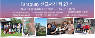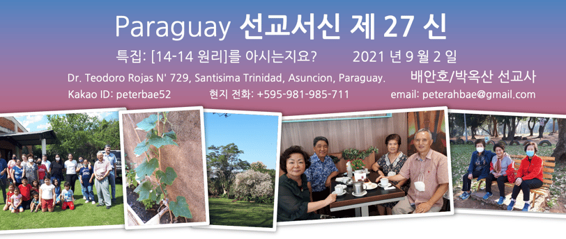 2년째 우리 모두는 참으로 한번도 경험해 보지 못한 새로운 시대를 살고있습 니다. 파라과이는 2021년 1월 이후 계속 많은 비가 내려서 지난여름(1-4월)은 비교적 큰 더위없이 지난 것이 얼마나 감사한지요. 저희 내외는 이즈음에 2개의 국립공원에서 매일 2-5명씩 전도하는 기쁨을 누리고하고 있습니다. 지난 5년간 목양 하던 갈보리교회를 현지 목회자에게 이양하였습니다. 지난 4월에는 저희 부부가 ‘호박잎 식중독 사건’으로 큰 홍역을 치루었습니다. 제가 지난 50년간 성경을 연구하며 발견한 하나님의 구원경영의 대 원리 ‘14-14 원리’를 선교서신 독자들과 이번 27신에서 처음으로 나누고자 합니다.